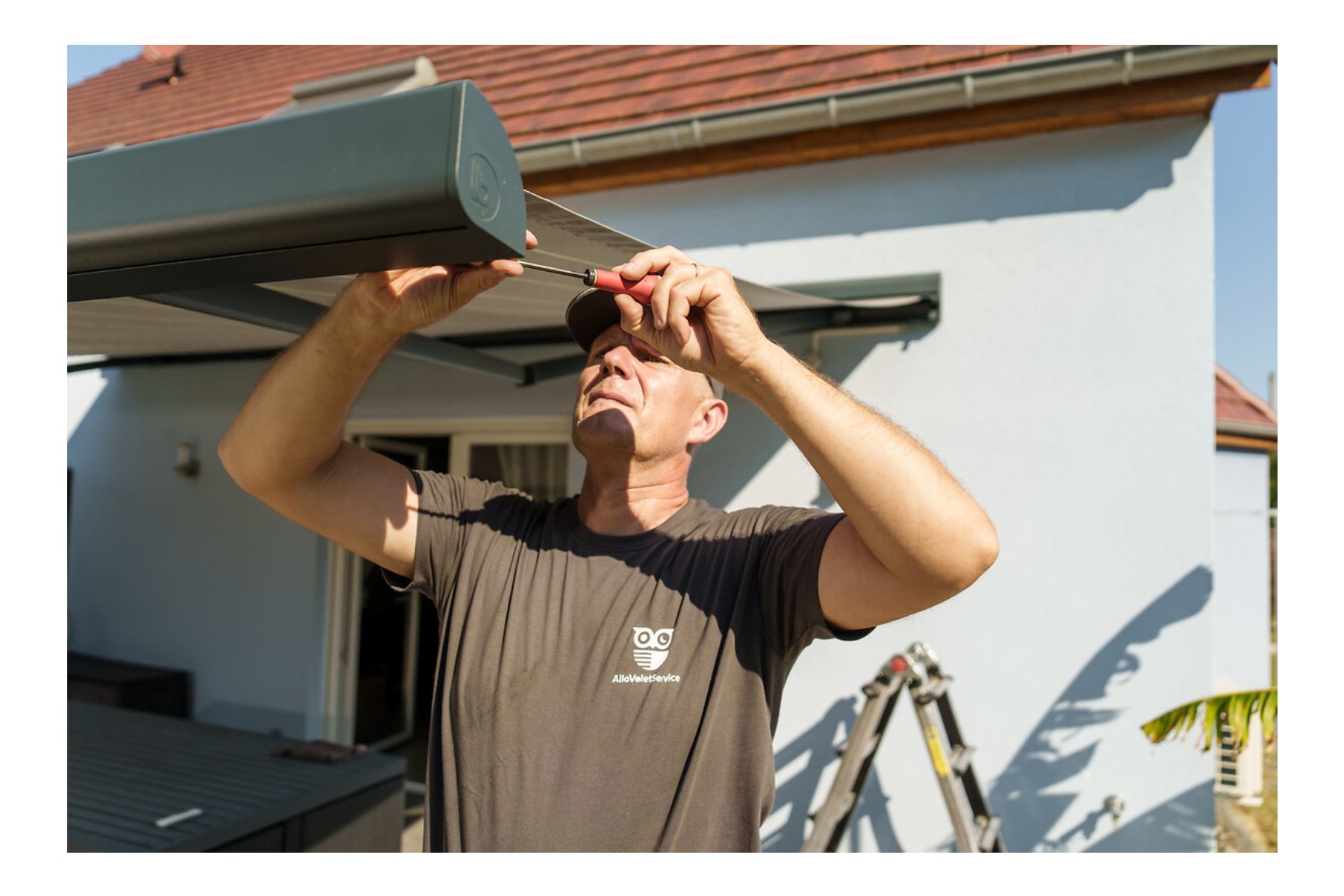 - intervention « longue » : l’intervention peut prendre un peu plus de temps s’il est nécessaire de changer une ou plusieurs pièces (support de bras, treuil, moteur ou bras articulés complets) sur le store. Dans ce cas, je remplace la ou les pièces endommagées(s) et effectue ensuite les réglages nécessaires au bon fonctionnement du store ;